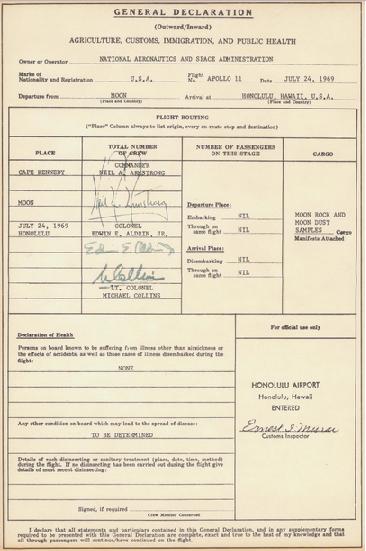 月に行ったアポロ11号の宇宙飛行士たちが、帰ってきたときにシャレで記入した本物の入国審査だそうです。