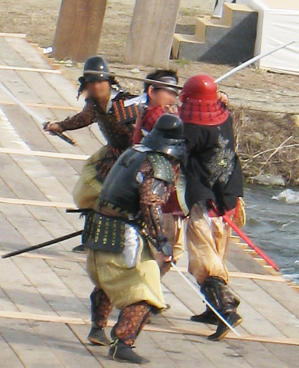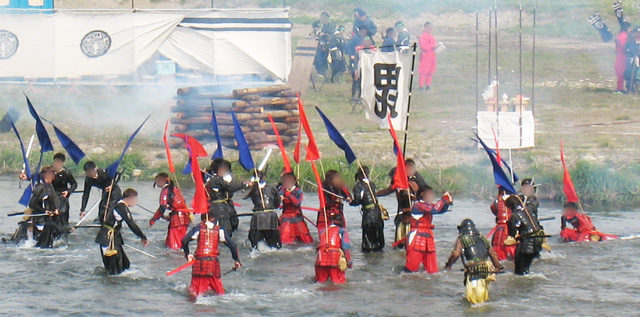 史実を参考にシナリオもありまして、リハーサルして合戦に臨む私たち。川を渡る橋の上では殺陣ショー的なものもありますので、斬り方自由死に方自由!川に入っちゃっての戦いもありなかなかハードです。一人流されて待機してる消防隊に救助されました。