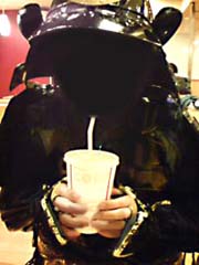 鎧でティッシュ配ったり水着売り場に行ってみたかったが、とりあえず汗だくなので近所のファーストフードでまったりする武将二人。