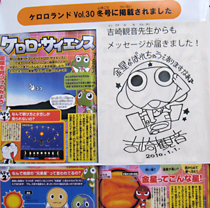打ち上げたものに乗せたネームプレートも展示されてました。こちらはケロロ軍曹の吉崎先生から。ケロロが宇宙へ…!ていうかもともと地球外生物だったよ彼ら。地球に馴染みすぎてて忘れそうに。