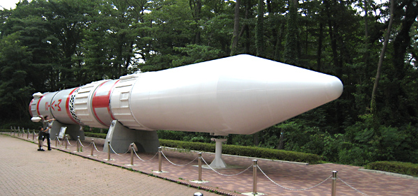 正門で受付を済ませ緑に囲まれて歩いていくと、右手には過去のM-Vロケット原寸模型が鎮座しています。打ち上げでよく聞くH-ⅡAロケット。それに積むにはちと小ぶりなんだよね~という衛星さんたちはこちらのロケットに乗っけていくんだそうです。
