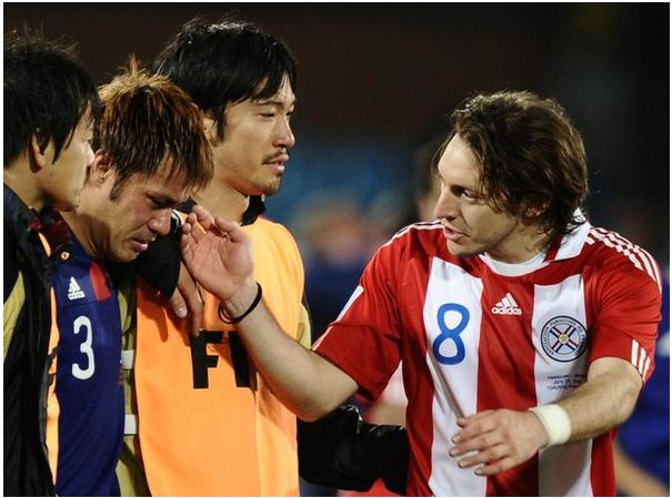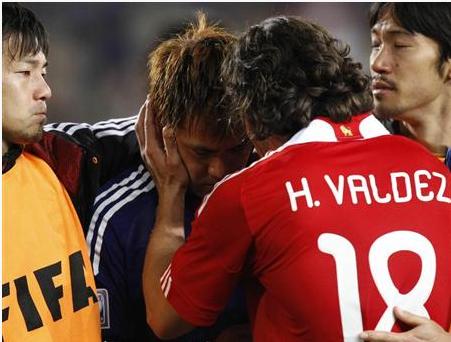 バルデスのほかにも、パラグアイ選手のエドガー・バレットも慰めに来ていたもよう。腐女子も喜びそうなこの図式。なんなんだ、いい奴すぎるぞパラグアイの二人。惚れてまうやろー!