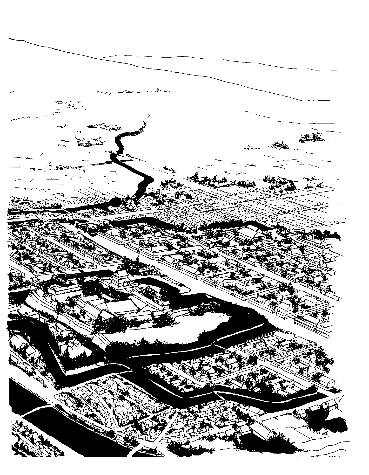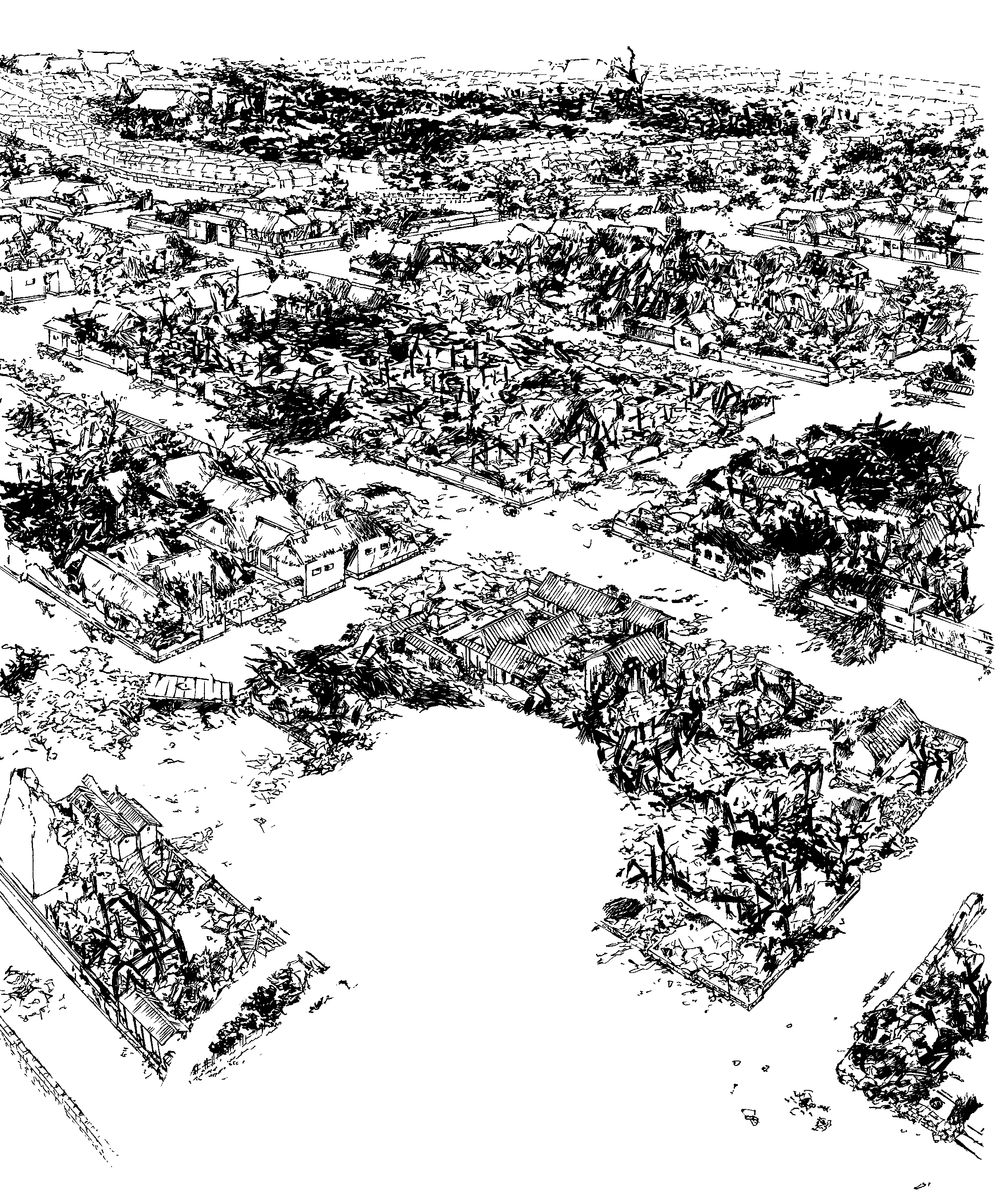 古地図の建物配置と絵をもとに描いているので、だいたいの建物のならびは合っているはずです。