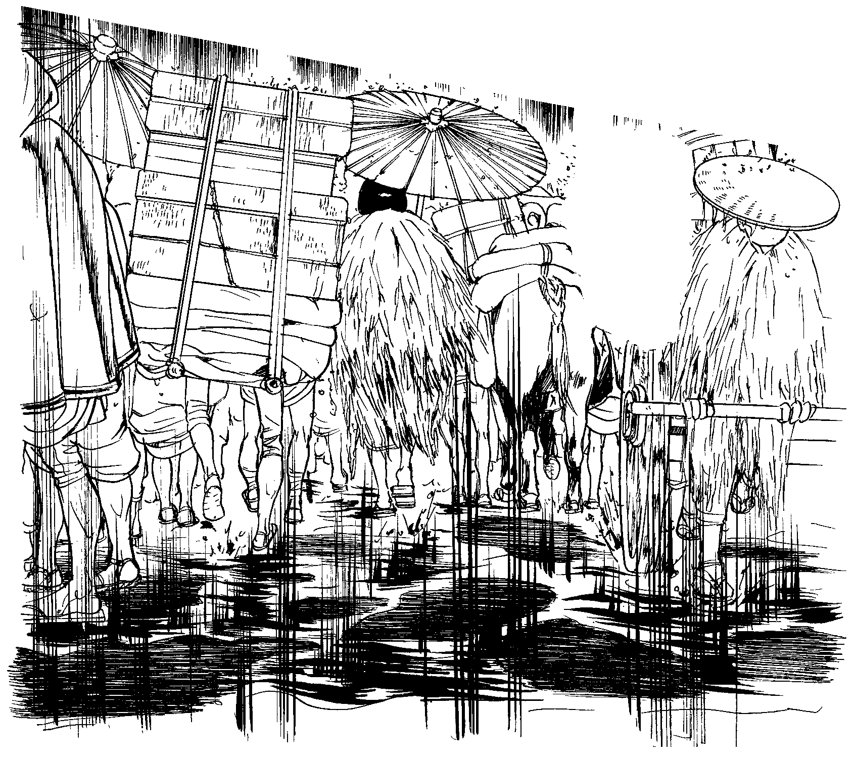 雨のなか避難する人々(町民)