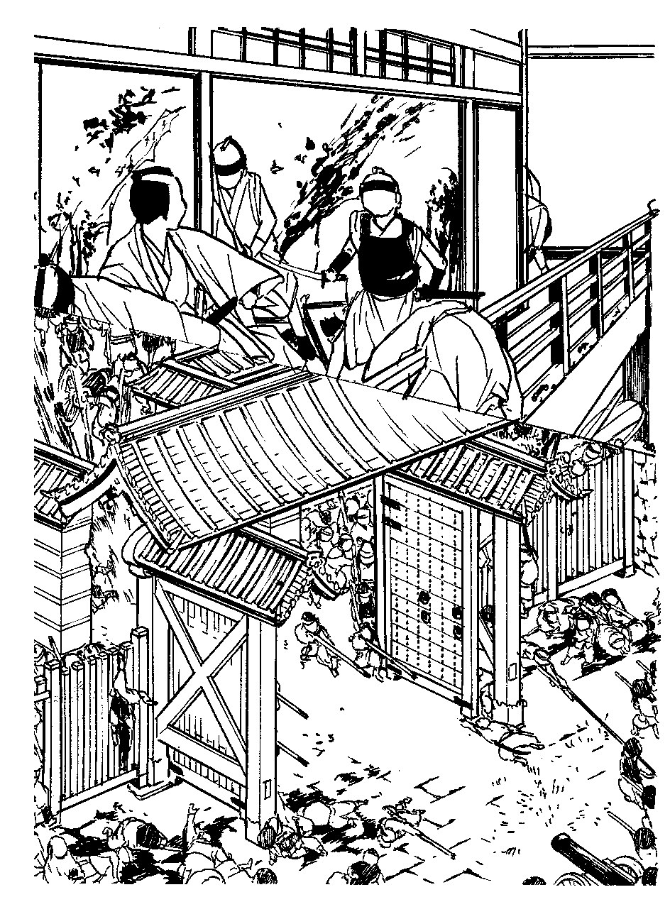 現在の蛤御門の写真と、蛤御門の絵を参考に戦闘中の様子の想像図